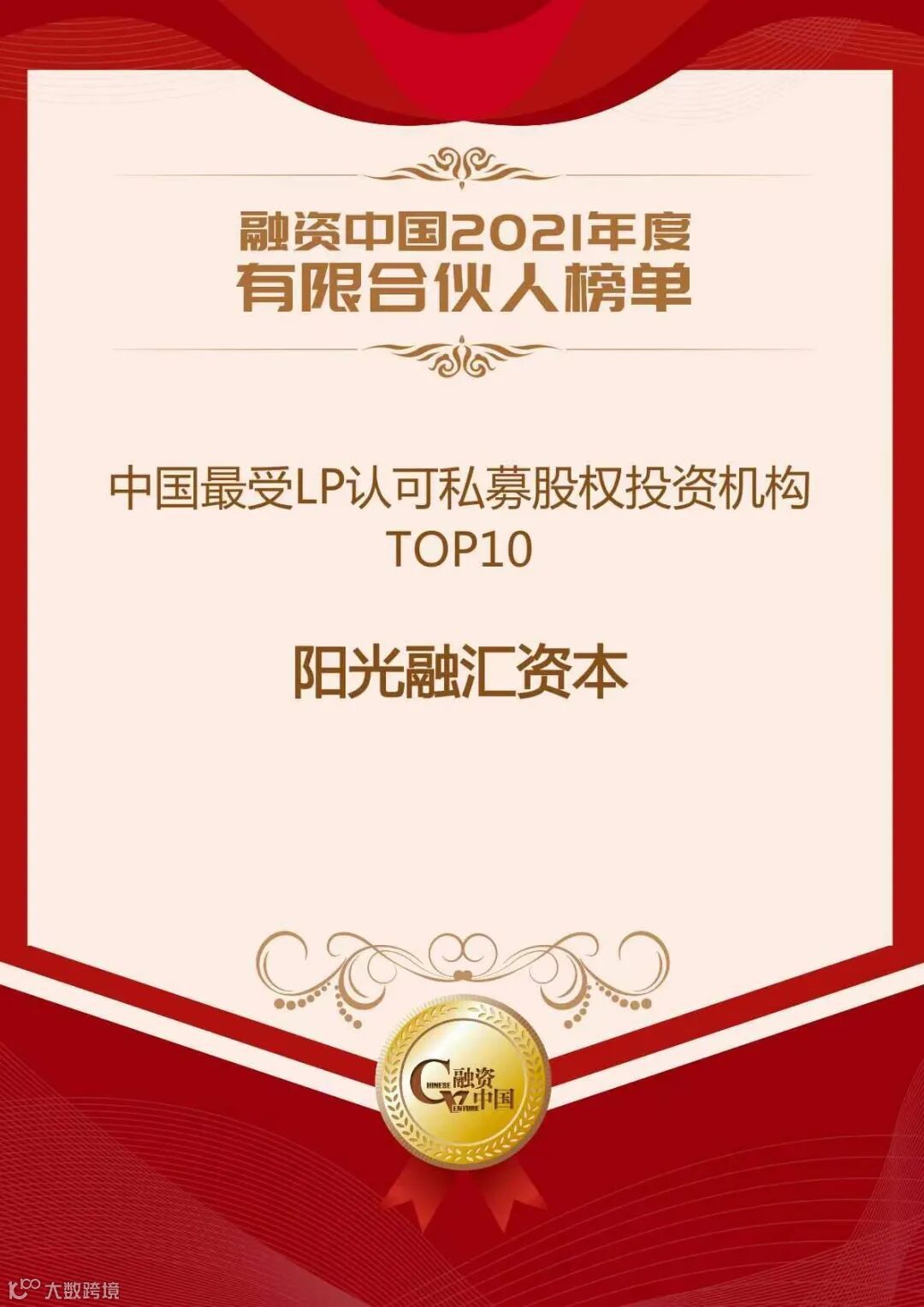 2022年5月12日,融资中国发布了《2021年度有限合伙人榜单》,阳光融汇资本荣膺【2021年度中国最受LP认可私募股权投资机构Top10】。