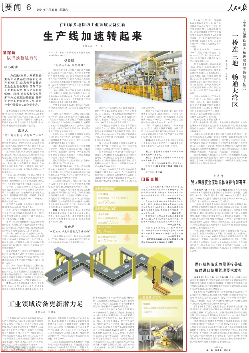 7月20日,人民日报要闻6版以《在山东多地探访工业领域设备更新 生产线加速转起来》为题,点赞山东落实《推动大规模设备更新和消费品以旧换新行动方案》这一政策下,淄博、潍坊、烟台等地多家企业的亮点举措。