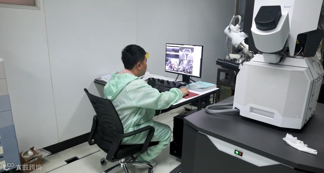 实验室内放置的是一个聚焦离子束的机台,工作人员正在做透射样品的制备,将蓝宝石剪薄到100纳米以下的尺寸,达到透射机台可以拍照的要求,便于进行一些高分辨的分析。
