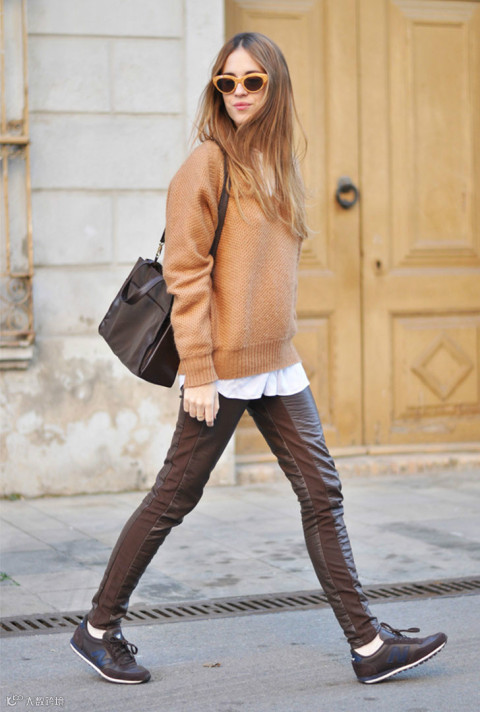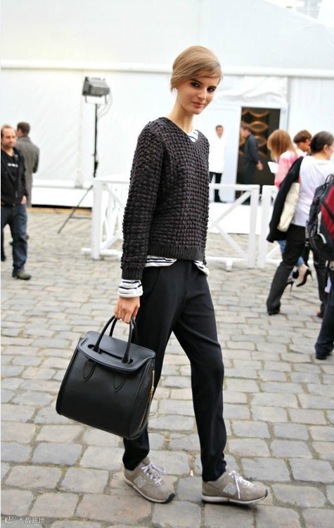 NB搭配小脚裤,营造上松下紧的效果,好身材就算是平底鞋也挡不住。而且运动鞋的搭配增加了年轻的活力。