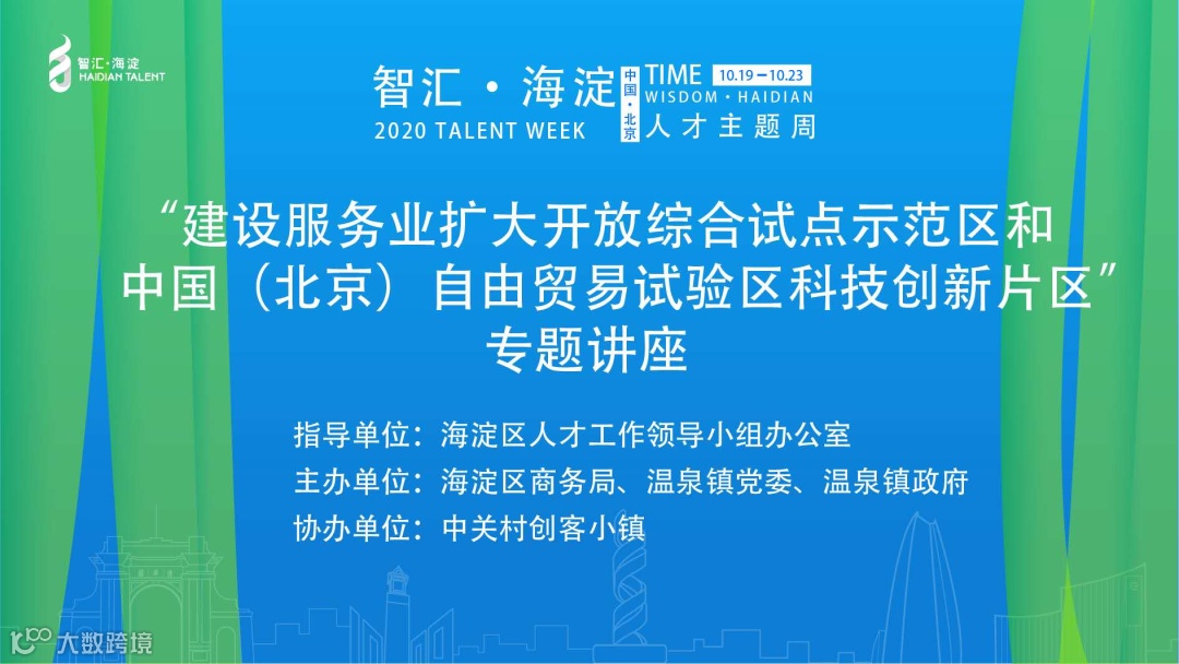 作为2020年“智汇海淀”人才主题周系列活动之一,10月23日上午,在海淀区人才工作领导小组办公室的悉心指导下,由海淀区商务局、温泉镇党委、温泉镇政府主办,中关村创客小镇协办的“建设服务业扩大开放综合试点示范区和中国(北京)自由贸易试验区科技创新片区”专题讲座在中关村创客小镇路演大厅举办。
