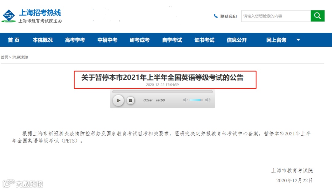 上海市教育考试院也发布公告称
