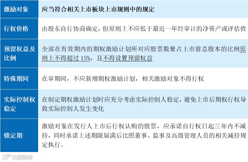 不同于上市前制定实股计划或上市前完成行权的期权计划对激励总量、授予价格、行权安排等可以根据企业发展需求进行灵活设置,“带期权上市计划”的必备内容与基本要求、激励工具的定义与权利限制,行权安排,回购或终止行权,实施程序等内容,应参考《管理办法》的相关规定予以执行。同时,就“带期权上市计划”的设置安排还需关注以下要点: