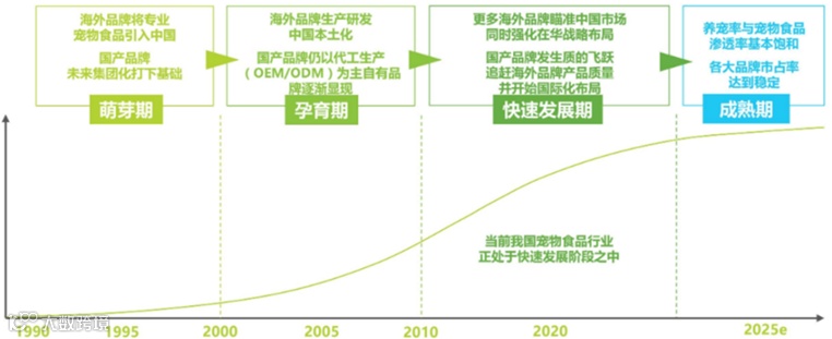 我国宠物食品行业经历了萌芽期、孕育期、快速发展期和成熟期,目前仍然处于快速发展期。