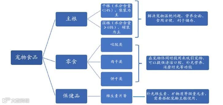 1)宠物主粮是宠物最主要的食品,所含营养素和能量能满足犬猫每日全面营养需求的宠物食品,可分为干粮与湿粮两种。