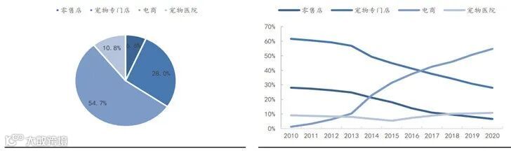 我国宠物食品渠道主要包括电商、宠物店、宠物医院等,目前线上化率超过50%,过去10年线上化率快速提升。由于线上主要是淘宝、京东等大型平台,诞生了众多的互联网品牌,可以预见的未来几年,线上仍然是宠物新锐品牌的必争之地。