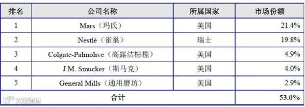 美国、欧洲等发达国家和地区的宠物食品行业起步较早。目前,以美国玛氏、瑞士雀巢为代表的宠物食品企业占全球宠物食品市场的份额较高。截至2020年末,该等企业在全球的市场份额如下: