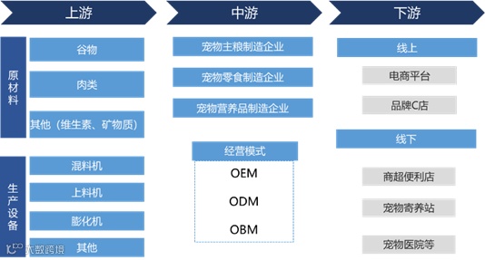 宠物食品行业按照产业链可以分为上、中、下游,其中上游主要是原料和生产设备,中游主要是加工制造和品牌企业,下游主要是销售渠道。