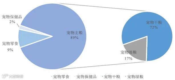 根据欧睿数据显示,2020年我国宠物食品消费结构中,宠物主粮、宠物零食和宠物保健品占比分别为89%、9%和2%。