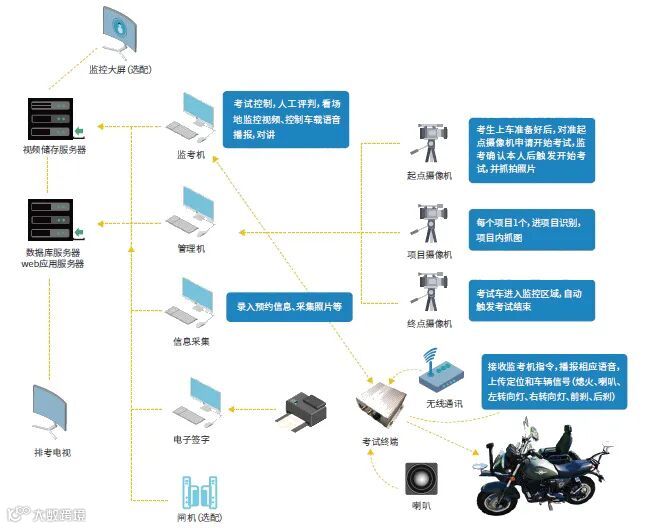 3.系统对摩托车科目二、科目三考试的考前信息录入和身份验证、考中监考和考后电子签名和成绩单打印,全流程管理与控制。