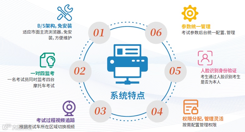 精英智通自主研发的摩托车考试系统满足了《机动车驾驶人考试系统通用技术条件 第3部分:场地驾驶技能考试系统》中场考系统的要求;规范考试流程;能够确保考生身份信息的真实性,考试过程信息(预约信息、考试记录、抓拍照片、考试视频)的完整性。