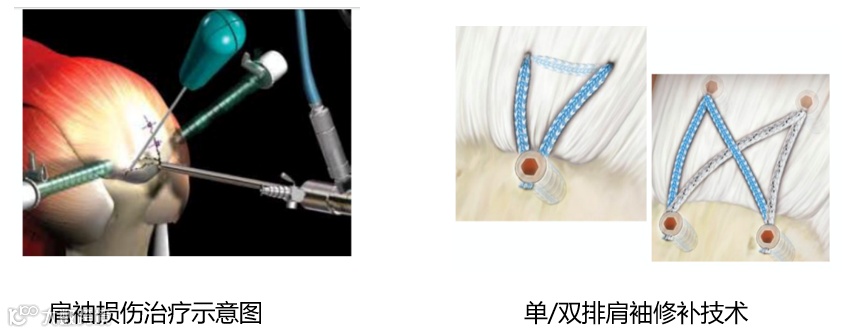 肩关节疾病的治疗手段是通过带线锚钉、缝线以及相关配套工具对肩袖撕裂的部位进行缝补,具体治疗手段如图所示。
