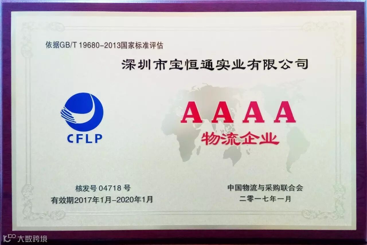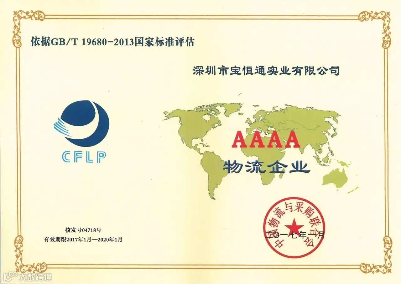 2017年1月13日,宝恒通顺利通过AAAA级综合服务型物流企业评审认证,并于4月21日荣获中国物流与采购联合会颁发的奖牌及证书。