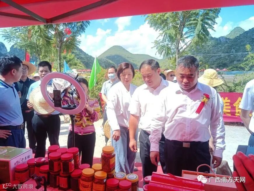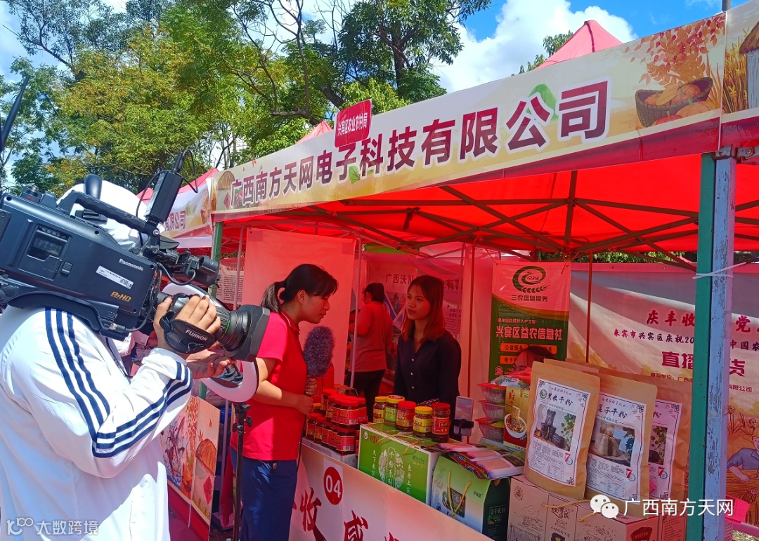 在兴宾区农业农村局的领导下,南方天网携手各乡镇主要益农信息社信息员,为现场观众带来黑米、葛根、莲子干粉,富硒红米、蜂蜜、覃阿姨酱菜、红心柚子等十几种特色农产品,并借助直播带货形式,进行全媒体传播。