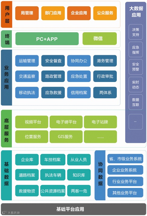 引入大数据和“互联网+”的理念和技术,切实提高业务协同能力、决策分析能力、精准执法能力、公共服务能力、应急处置能力‘五个能力建设’,真正实现明晰责任、团结协作、提高效率、精准服务的任务目标,构建集移动办公、执法监督、行业管理、公路管理、公共服务为一体的交通运输综合服务平台,打造“互联网+运输服务”科技前沿新常态。