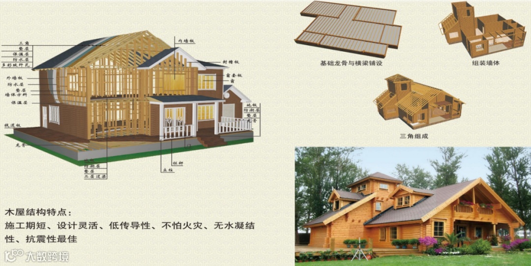 ①抗震、结构安全。构房由于自身重量轻,地震时吸收的地震力也相对较少;由楼板和墙体体系组成的空间箱形结构使构件之间能相互作用,它们在地震时大多纹丝不 动,或整体稍微变形却不会散架。如在旧金山、神户、台湾大地震中,绝大部分木结构房屋仍保持完整就是很好的证明。
