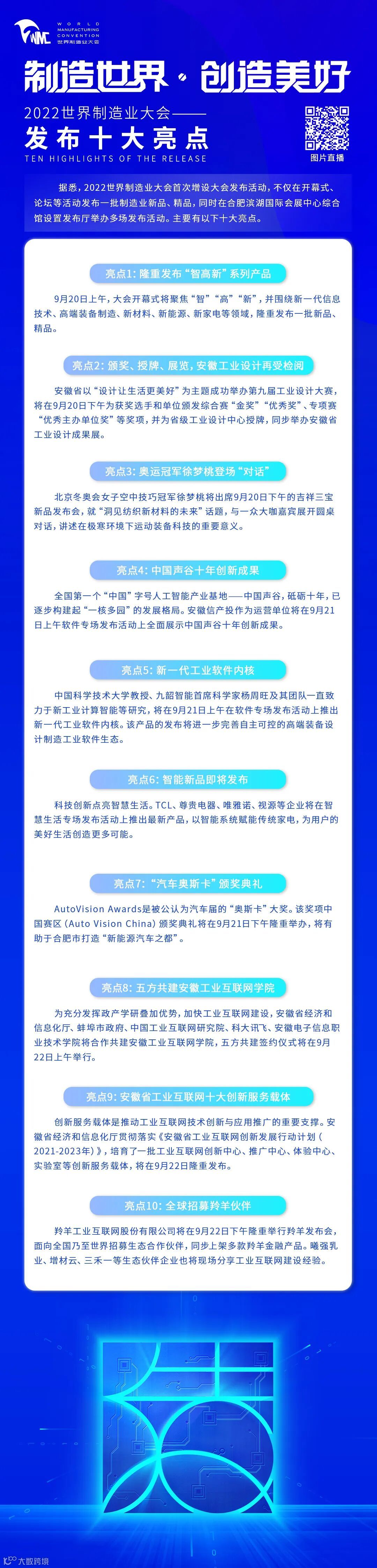 据悉,2022世界制造业大会首次增设大会发布活动,不仅在开幕式、论坛等活动发布一批制造业新品、精品,同时在合肥滨湖国际会展中心综合馆设置发布厅举办多场发布活动。主要有以下十大亮点。