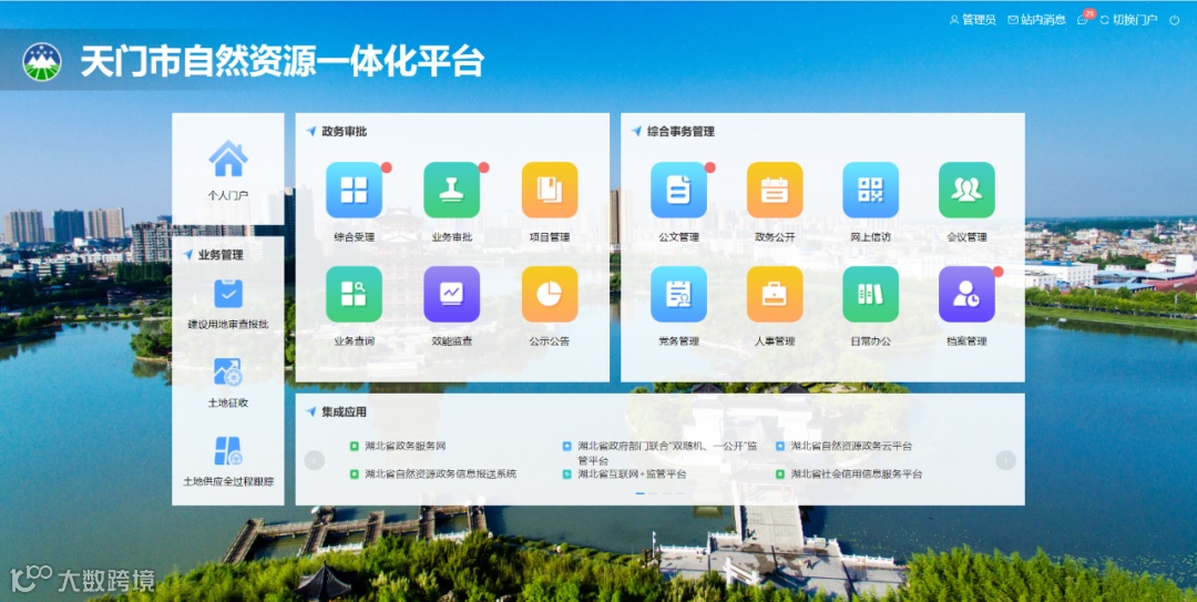 包含统一门户、一体化业务审批、一体化业务管理、自然资源空间管控与应用、综合办公、监督监管、移动APP和运维管理。