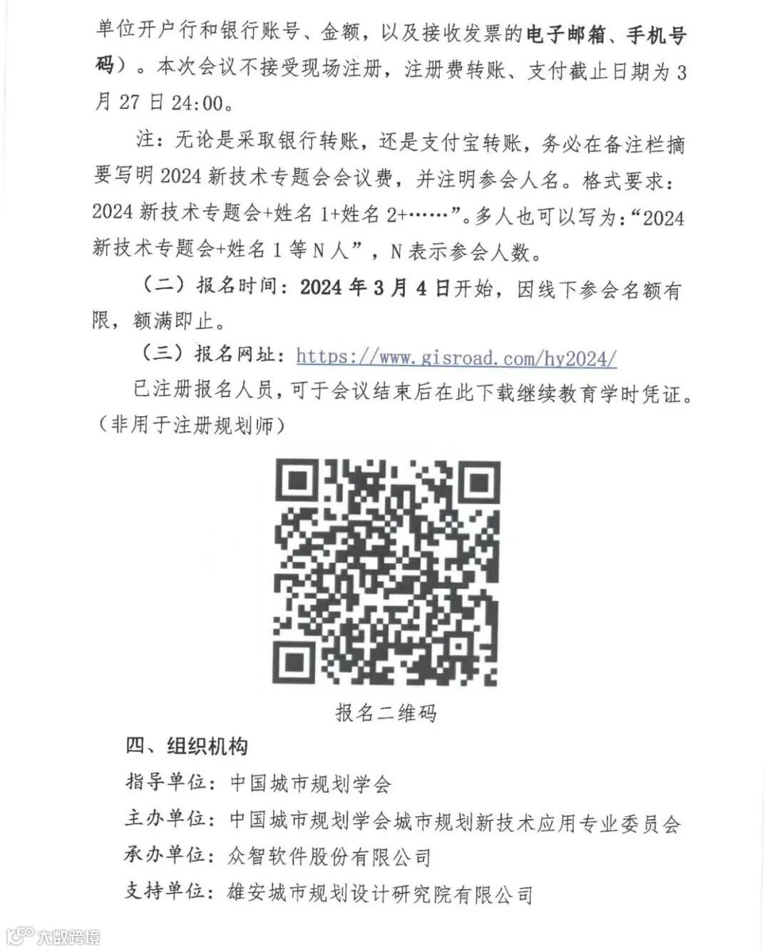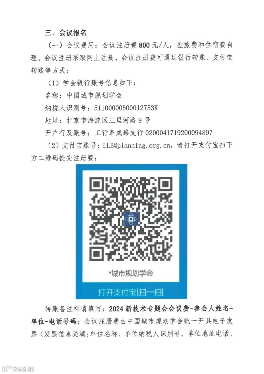 转账备注栏请填写:2024新技术专题会会议费-参会人姓名-单位-电话号码;会议注册费由中国城市规划学会统一开具电子发票(发票信息必填:单位名称、单位纳税人识别号、单位地址电话、单位开户行和银行账号、金额,以及接收发票的电子邮箱、手机号码)。本次会议不接受现场注册,注册费转账、支付截止日期为3月27日24:00。