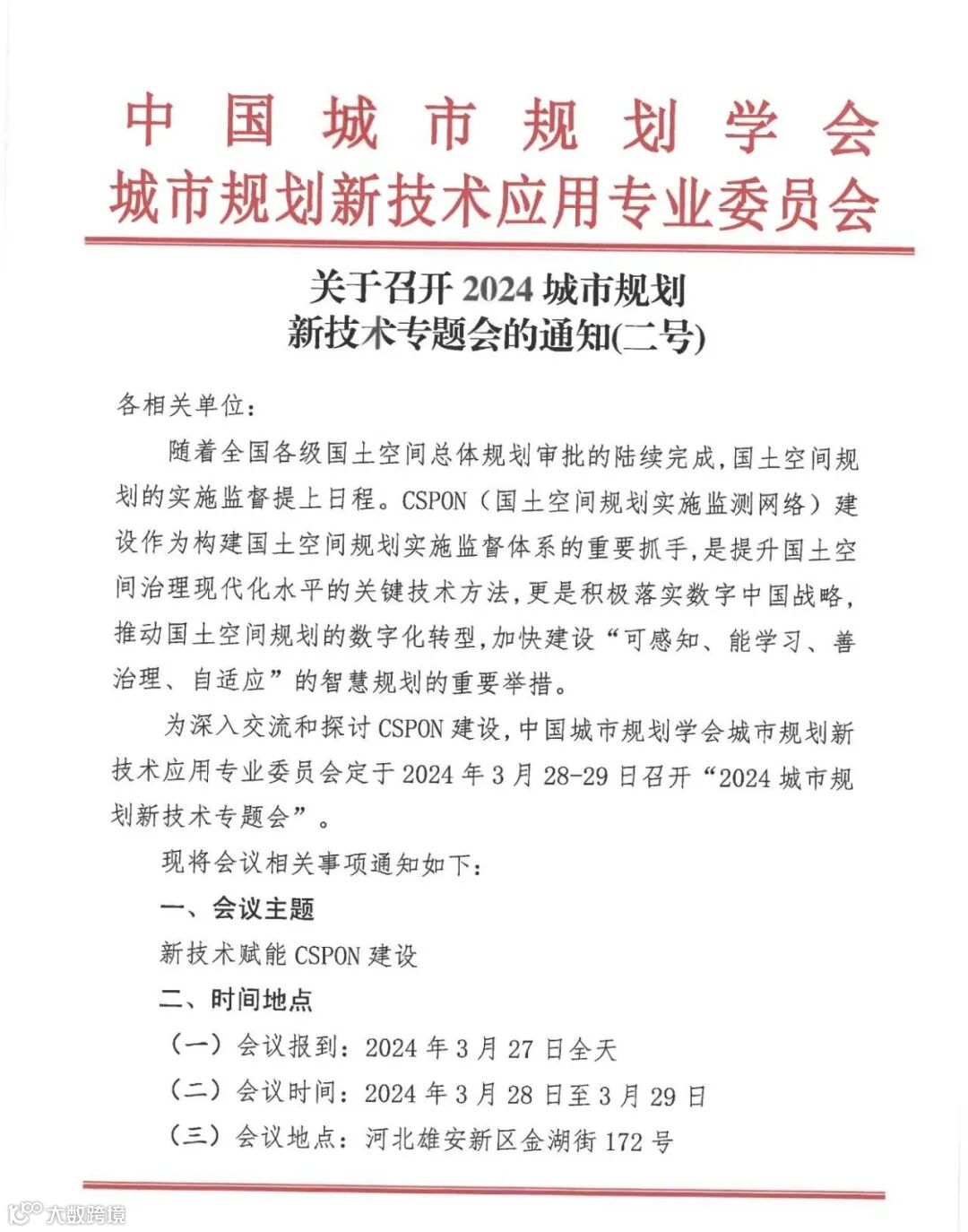 为深入交流和探讨CSPON建设,中国城市规划学会城市规划新技术应用专业委员会定于2024年3月28-29日召开“2024城市规划新技术专题会”。