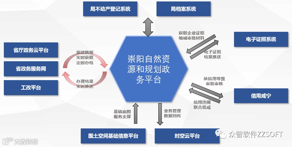 平台通过与湖北省自然资源厅政务云平台、湖北省政务服务网、咸宁工改建设项目审批系统、国土空间基础信息平台、时空云平台、电子证照系统、信用咸宁系统、局不动产登记系统、局档案系统等进行对接,实现横向、纵向多维度信息协同共享,优化自然资源和规划局服务模式、提升服务效能。