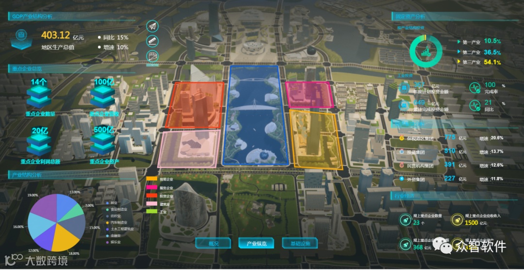 面向潜在投资人建设智慧招商应用,基于规划建设应用的相关数据及自然资源三维,通过三维立体和图文报表方式对全域基本概况、产业纵览、基础设施等信息进行可视化展示,助力教育产业与文旅康养等战略性新兴产业的招商。