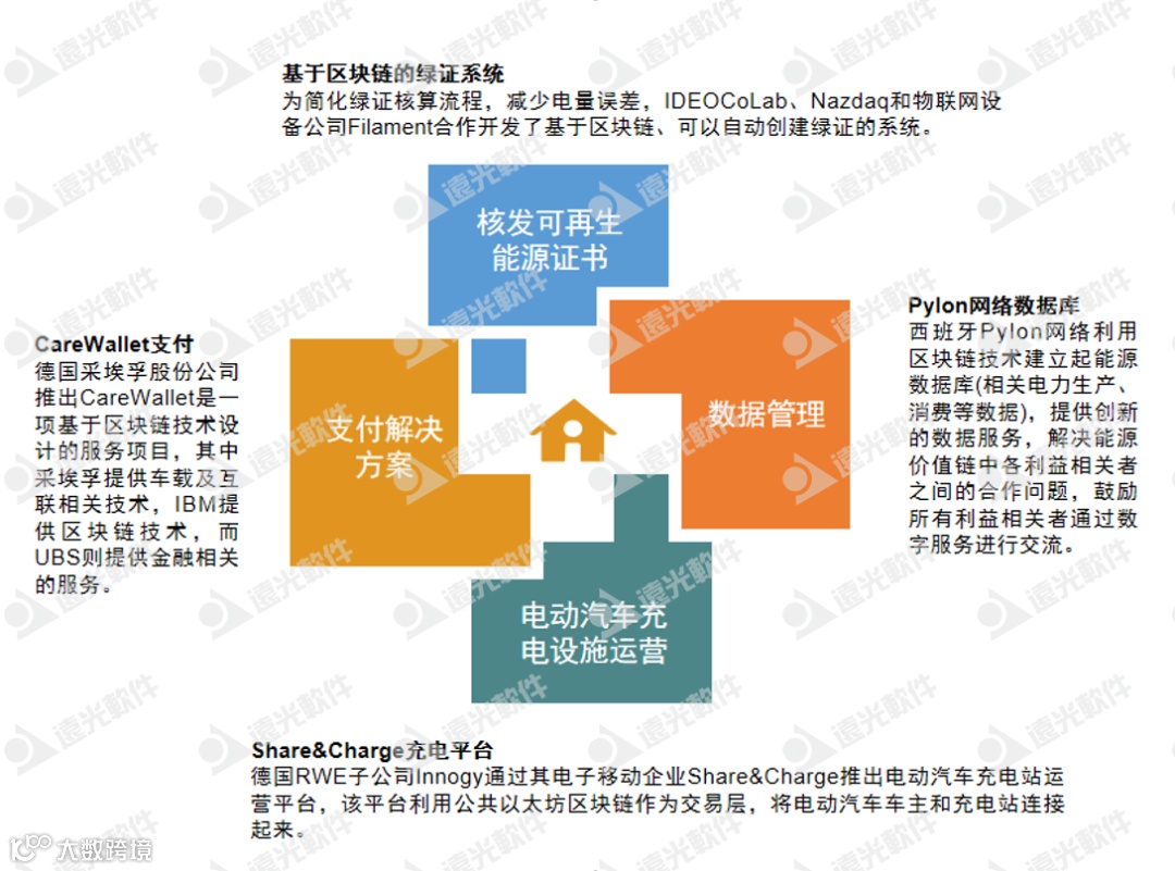 目前,能源区块链已在全球各领域实现了广泛的应用实践,国内外多家能源及相关企业已在能源交易平台、能源项目融资、绿色证书核发、支付解决方案、数据管理、电动汽车充电设施、分布式能源平台等领域积极展开探索,建设示范项目。