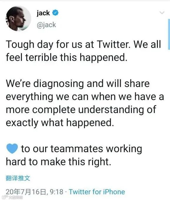 推特CEO杰克·多西在推特上表示,对推特来说,“这是艰难的一天”。他说:“我们对发生的事情感到难过,我们正在诊断问题,当我们对此事有全面的了解后,将会向公众分享我们所能分享的一切。