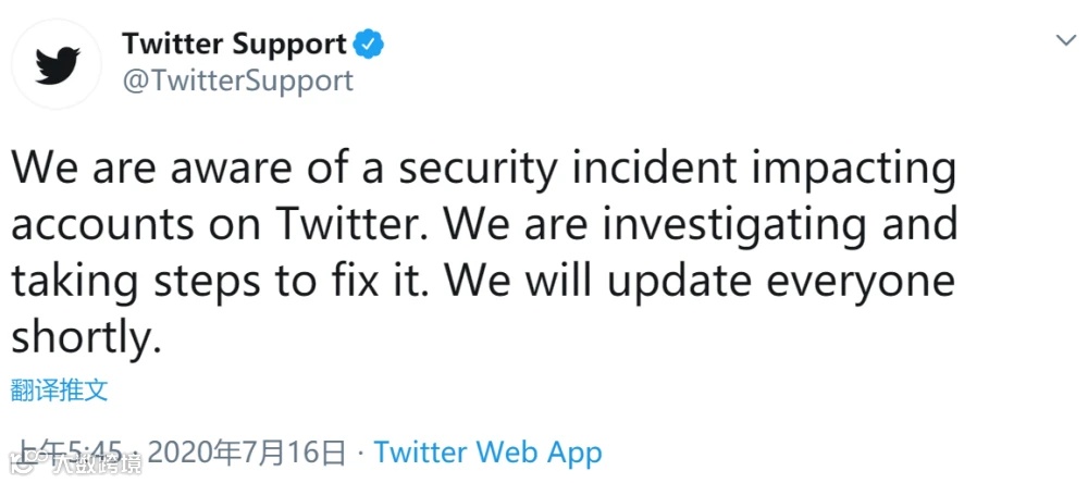 随后推特官方账号发文称:“我们发现了一个影响推特账号的安全事故,我们正在调查并采取行动修复它,很快就会向大家更新动态。”