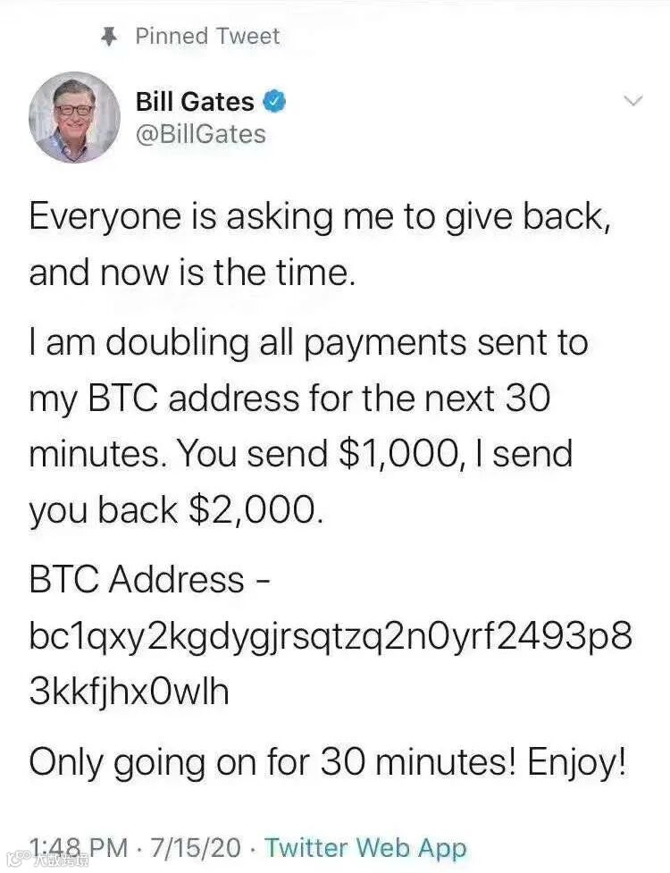 “每个人都让我回馈社会,现在是时候了。只要接下来30分钟之内向我的比特币账户打钱,我将双倍奉还。你发我1000美元,我会发回你2000美元。仅30分钟内有效!快快行动吧!”