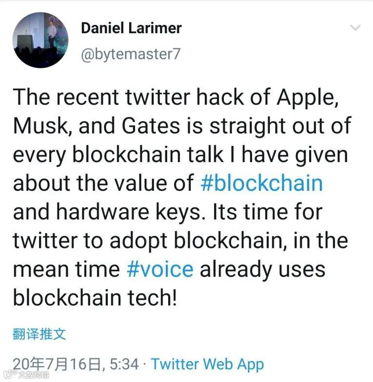 EOS创始人BM在其推特上表示:“……这与我在区块链和硬件密钥的价值上发表的每一次区块链演讲都是一致的。推特是时候采用区块链了,同时Voice已经在使用区块链技术。”