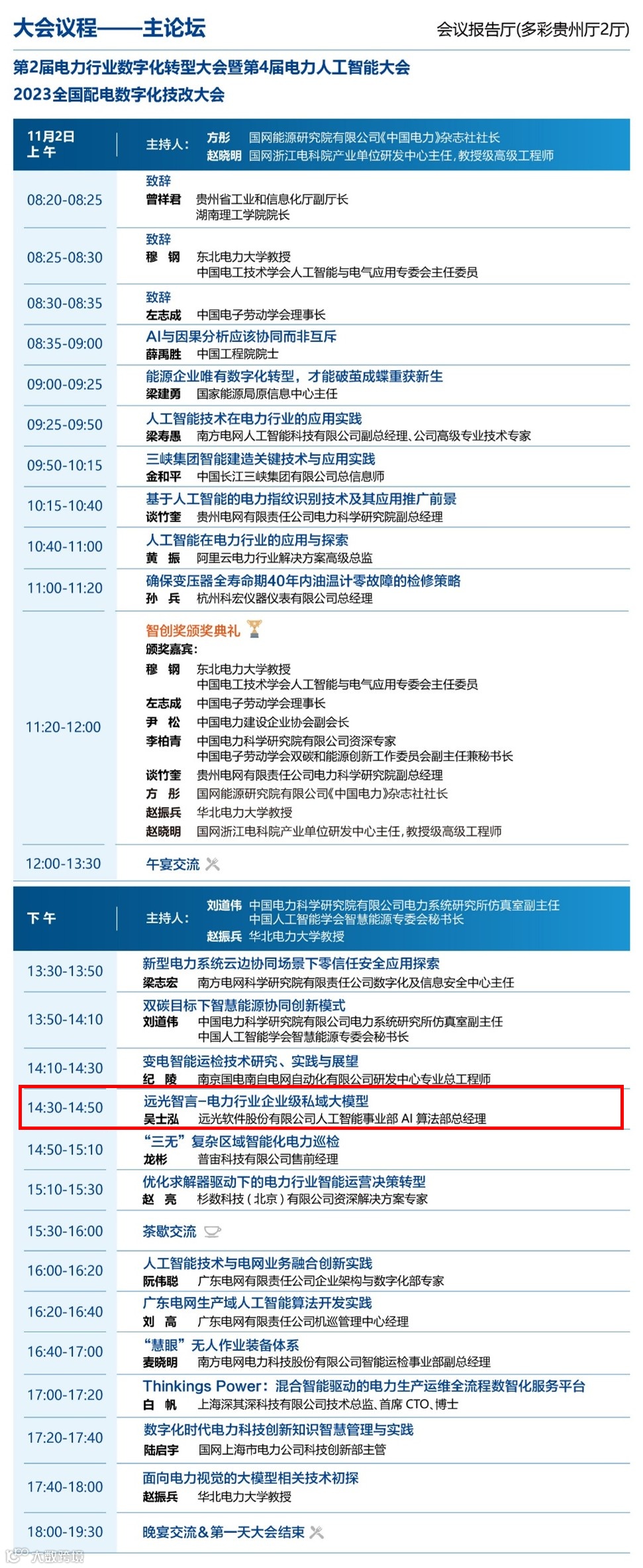 11月2-3日,“第 2 届电力行业数字化转型大会暨第 4 届电力人工智能大会”即将在贵阳举行。远光软件人工智能事业部AI算法部总经理吴士泓受邀参会,并将发表《远光智言-电力行业企业级私域大模型》主题演讲,分享远光软件以大模型为基座,融合模型微调和本地知识库,面向电力行业企业提供问答、写作、检索、摘要、提纲等一系列能力支持的生成式人工智能产品,助力电力企业加快数字化、智能化转型升级。