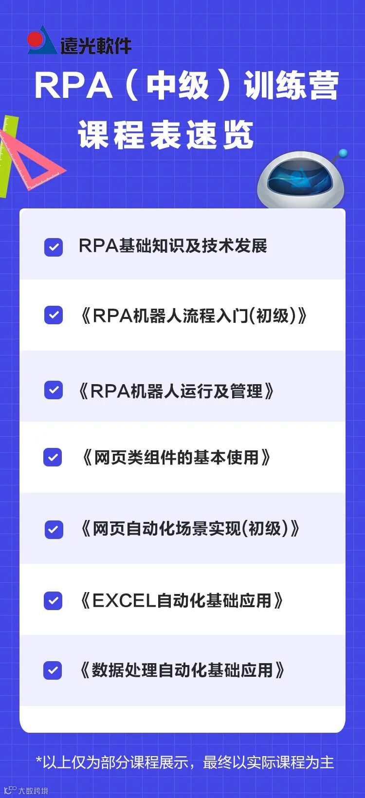 历经两年的发展与沉淀,2023年,第三届远光RPA云平台个人开发者训练营集结远光学堂专业师资力量再次启航,推出进阶版本的实践型产品学习类课程,采用混合式学习模式,精心设计各个环节,包含“训前预备”、“集训”、“实战练习”、“成果考核”等4大维度。