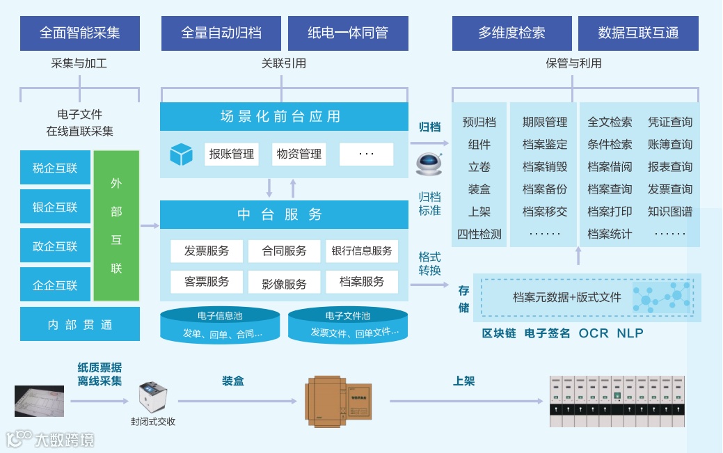 远光智慧档案从源头入手,将档案管理活动向前延伸至档案的形成阶段,通过外部直连、内部贯通以及离线补采的方式,全场景自动获取电子档案,形成结构化数据与非结构化数据,并相互关联,同时进行档案数据源头信息查验,确保数据源头的准确性以及电子档案的合规性。此外,通过在归档过程中建立档案数据间的有机联系,构建多源异构数据的自动汇聚归档,实现线上数据的一体化管理,推进前端业务的全流程电子化、线上化,加速推进无纸化办公。