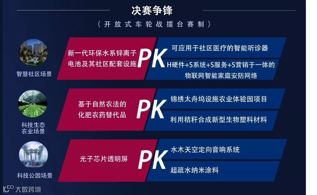 总决赛将采用车轮赛形式,三大场景中除卫冕冠军之外的两个项目分别进行一对一PK,胜出者将同卫冕冠军进一步角逐。每个项目在做完8分钟的陈述之后,以向对方提问的方式进行5分钟的互动辩论,最后现场评审打分评选出该场景第一名和第二名。