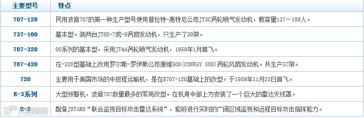 波音707:四发远程喷气运输机,主要型号包括707-120、220、320和420。中国曾购买过10架320C型。生产线于1991年关闭。