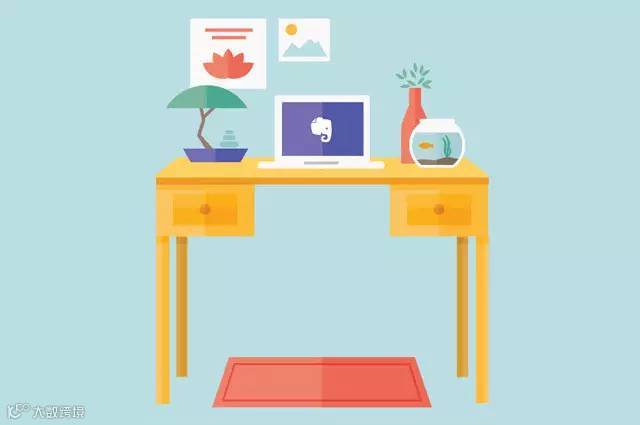 办公桌特点:摆着几盆绿植,养着一缸金鱼,墙上还贴着艺术画。