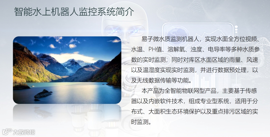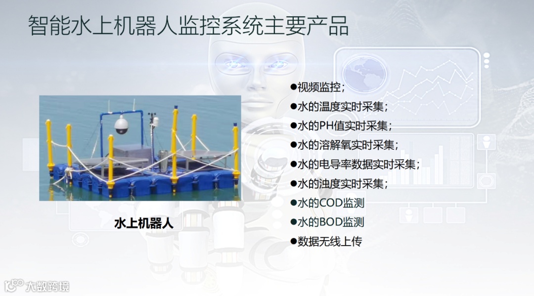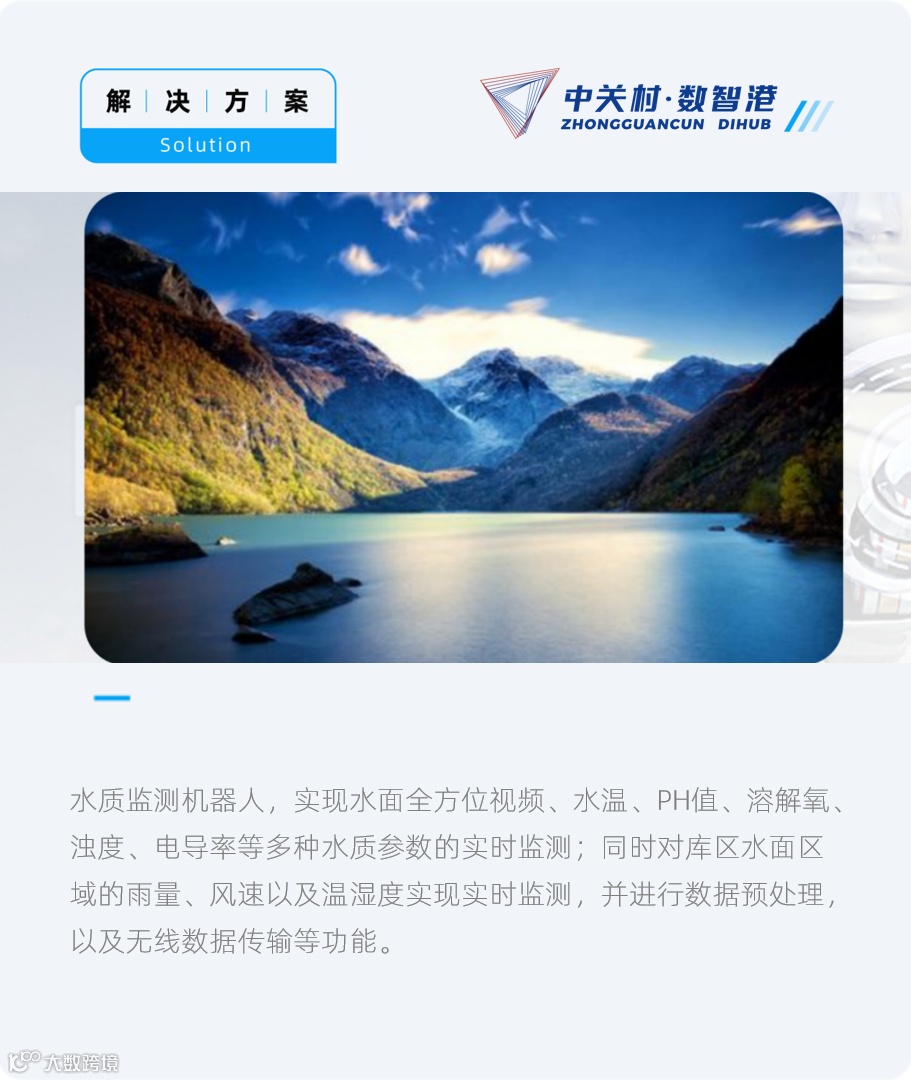 水质监测机器人,实现水面全方位视频、水温、PH值、溶解氧、浊度、电导率等多种水质参数的实时监测;同时对库区水面区域的雨量、风速以及温湿度实现实时监测,并进行数据预处理,以及无线数据传输等功能。