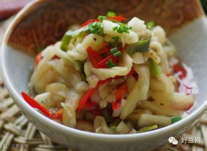 5.蒸熟的茄子只取瓤,用手撕成细丝;