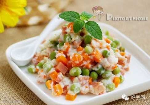 7.加入火腿丁、胡萝卜丁和豌豆,一同翻炒至奶液凝固即可。