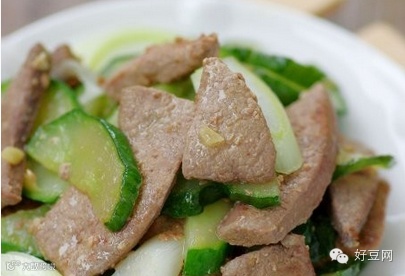 3.放入青瓜片,翻炒均匀,放入腌制好的猪肝;