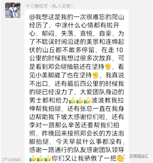 东莞德商汇来自不同优秀家庭组成的徒步俱乐部,我们热爱正能量、热爱健康、热爱家庭和谐、我们从徒步锻炼结缘认识东莞德商汇徒步俱乐部所有队友,感谢领队们组创徒步群给大家互相问好传递正能量交流的开放平台。平台是大家共同的让大家健康快乐,特别感谢各位会长和各位队长们长期为平台付出了大量时间精力和金钱,不管风雨日晒无阻以及节假日一直都在每一期组织徒步活动,在他们带领下从未停下一期的活动,他们用行动坚持已经第四个年头留下无数感动的故事在路上,这一切坚持实属不易,再次感谢他们无私奉献!