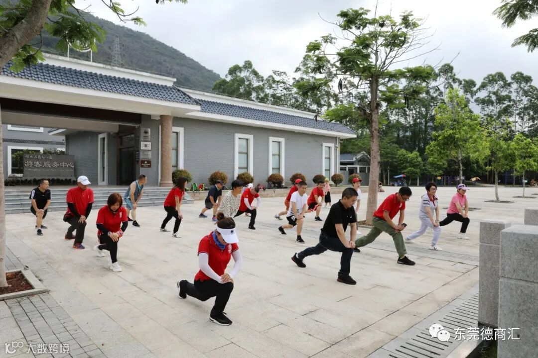 包队和金队、何队带领大家一起做徒步前热身拉伸