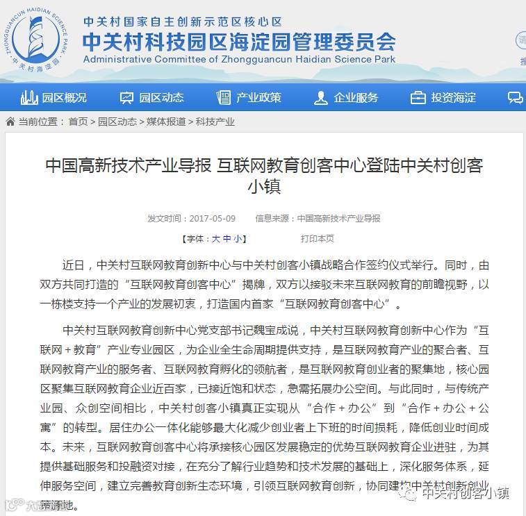 随后,中关村创客小镇举办了与互联网教育中心签约入驻的活动仪式,也得到了中关村海淀园管委会的关注,在官网首页推送了标题为“互联网教育创客中心登陆中关村创客小镇”的新闻。