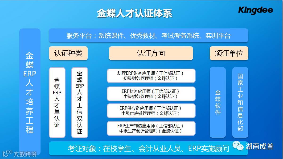 金蝶ERP人才工信双认证:工信双认证是由金蝶公司推出的将金蝶ERP认证和工业与信息化部认证相结合的认证体系。参加双认证考试合格的学员可以同时获得由工业和信息化部电子教育与考试中心颁发的ERP应用师职业资格培训证书及金蝶公司颁发的金蝶ERP认证证书,并进入全国信息技术人才库及金蝶后备人才库。