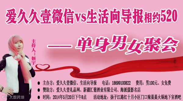 爱久久壹(微信号:love991cn)乌鲁木齐单身交友活动正在进行中,点击标题下“爱久久壹”关注后,回复活动即可报名!看完后记得分享!关注后回复“首页”可抽奖、购物、交友等