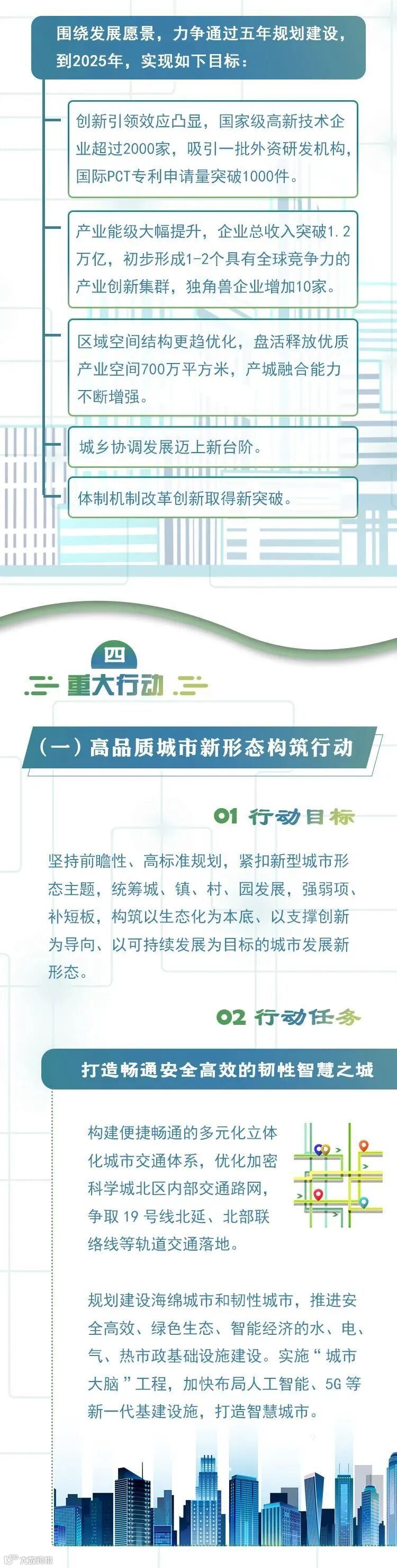 发展行动计划提出,未来5年,中关村科学城北区将聚焦高精尖产业发展,推进“前沿科技+新兴产业”融合创新,加速创新技术向产品化、产业化转化,将科学城北区打造成为全球前沿科技试验和应用的首选地。力争通过五年规划建设,到2025年,中关村科学城北区建设国家级高新技术企业超过2000家,国际PCT专利申请量突破1000件。产业能级大幅提升,企业总收入突破1.2万亿,初步形成1-2个具有全球竞争力的产业创新集群。盘活释放优质产业空间700万平方米。