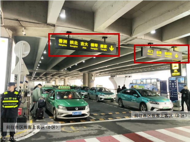 可在一楼到达大厅(03)出口出来前行25米左侧,到达西区出租车排队通道上客点。