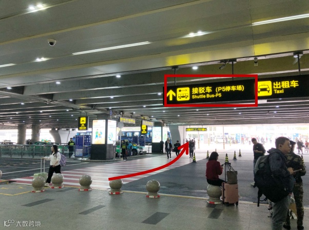 车辆停放在P5停车场的旅客,可在一层到达大厅(03)出口前行40米左侧,乘坐P5停车场免费接驳车前往停车场。