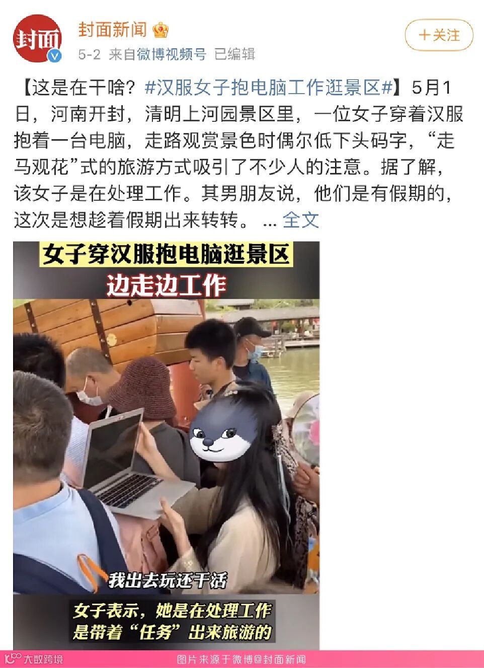 在这种迷眼糟心的补班模式下,仍有不少人不能完整地享受假期。抱着电脑逛景区,打着电话坐大巴。老板只要call,你得及时到。若是沉溺假期不可自拔,返岗后被新人顶了位置,就真的能拥有一个超长假期了。